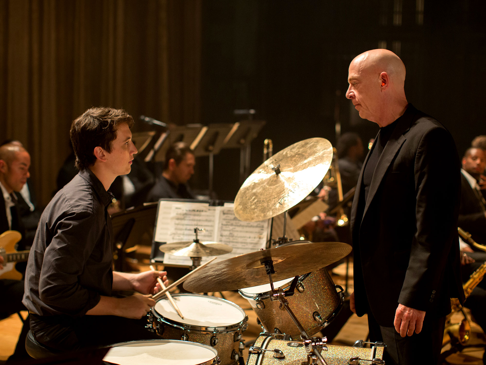 We’re at the fictional Shaffer Conservatory of Music in New York City — “the best music school in America.” Andrew Neiman (Miles Teller) is introduced through a doorway as he practices alone, his drumming accelerating until it is one continuous noise. The camera slowly glides along the corridor and through the door. Andrew looks up and the shot reveals itself as being from the perspective of Fletcher, the black-clad, bulging-eyed conductor of the first band. Andrew’s jaw drops as if it was the Messiah himself.