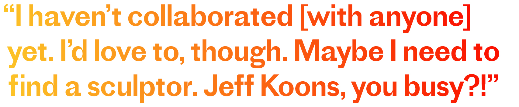 I haven’t collaborated [with anyone] yet. I’d love to, though. Maybe I need to find a sculptor. Jeff Koons, you busy?!