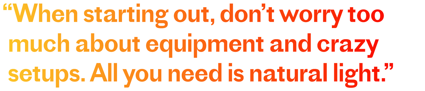 When starting out, don’t worry too much about equipment and crazy setups. All you need is natural light. A cloudy day is great for soft lighting, and a sunny day is perfect for harsh shadows. Adobe Photoshop has always been a lifesaver for helping improve the pictures afterwards. I think it’s best to learn and improve as you go, and I love this quote by Arthur Ashe: “Start where you are. Use what you have. Do what you can.”