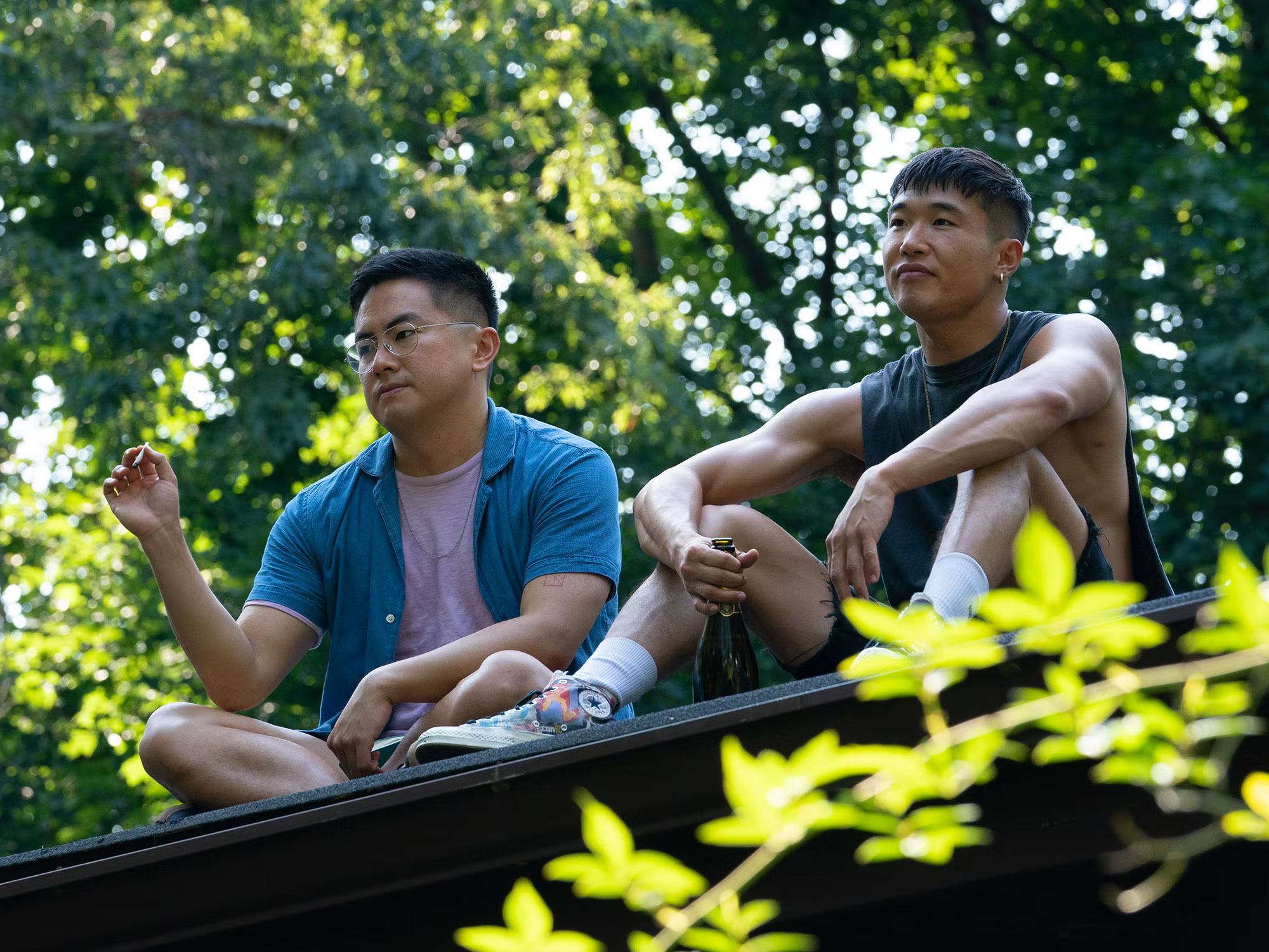 Pride and Prejudice is both a biting social satire and a love story, the latter leading to many attempts to recreate Firth’s infamous damp shirt scene. Rather than go the obvious route à la Bridgerton earlier this year, Fire Island subtly opts for a shirtless argument. I use subtly here because even though it occurs after attending an event with barely a stitch of clothing, it is not as blatant as a wet white top would be.