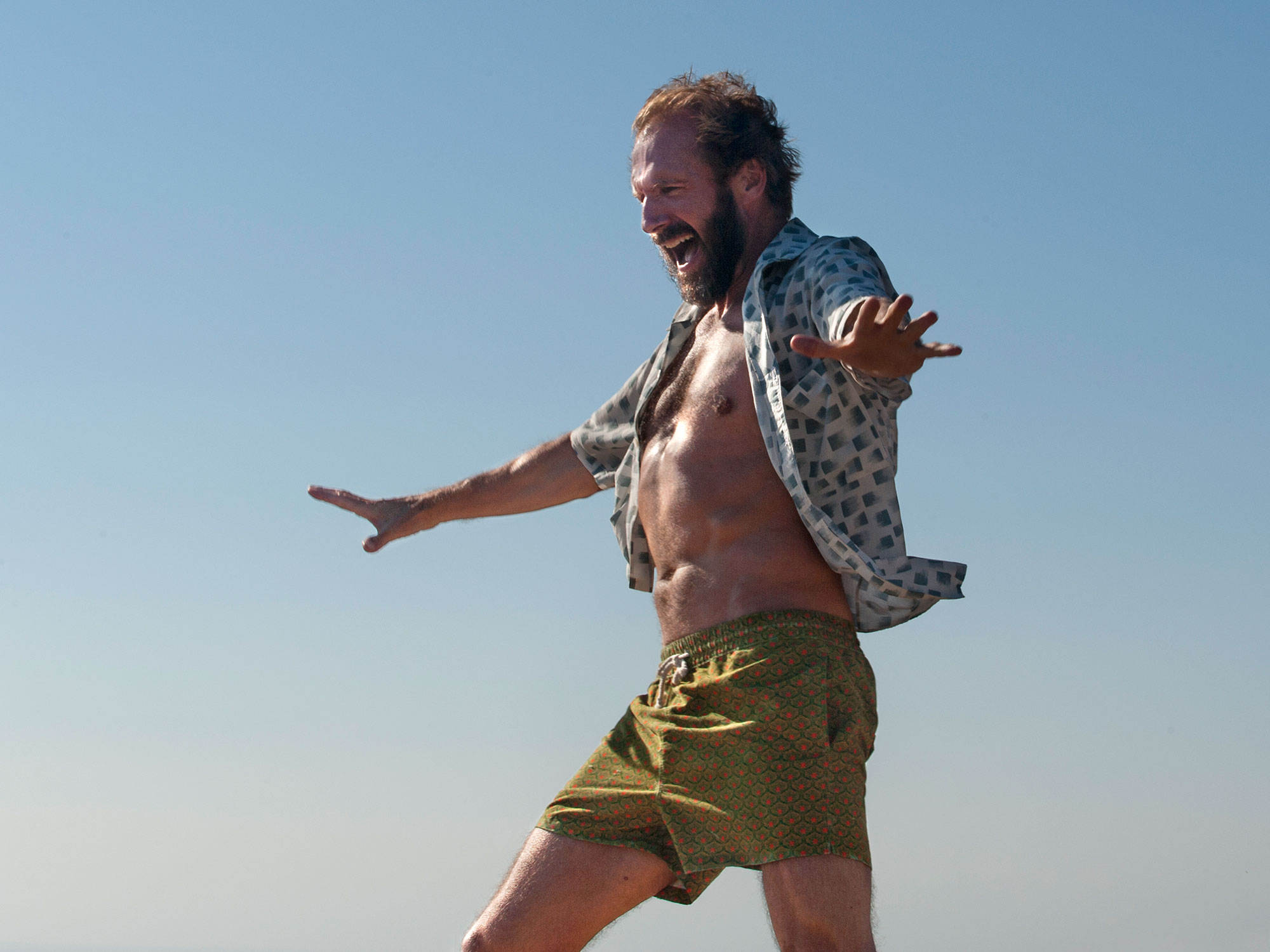 Departing from his typically straight-laced on-screen persona, Ralph Fiennes throws some serious shapes in director Luca Guadagnino’s new film, A Bigger Splash. Fiennes plays Harry Hawkes, an eccentric music producer who springs an unexpected visit on his rock-star ex-lover Marianne Lane (Tilda Swinton), who is holidaying with her boyfriend (Matthias Schoenaerts) on the Italian island of Pantelleria. In a stand-out scene, Hawkes gyrates to the Rolling Stones track ‘Emotional Rescue’ while strutting around Lane’s villa.