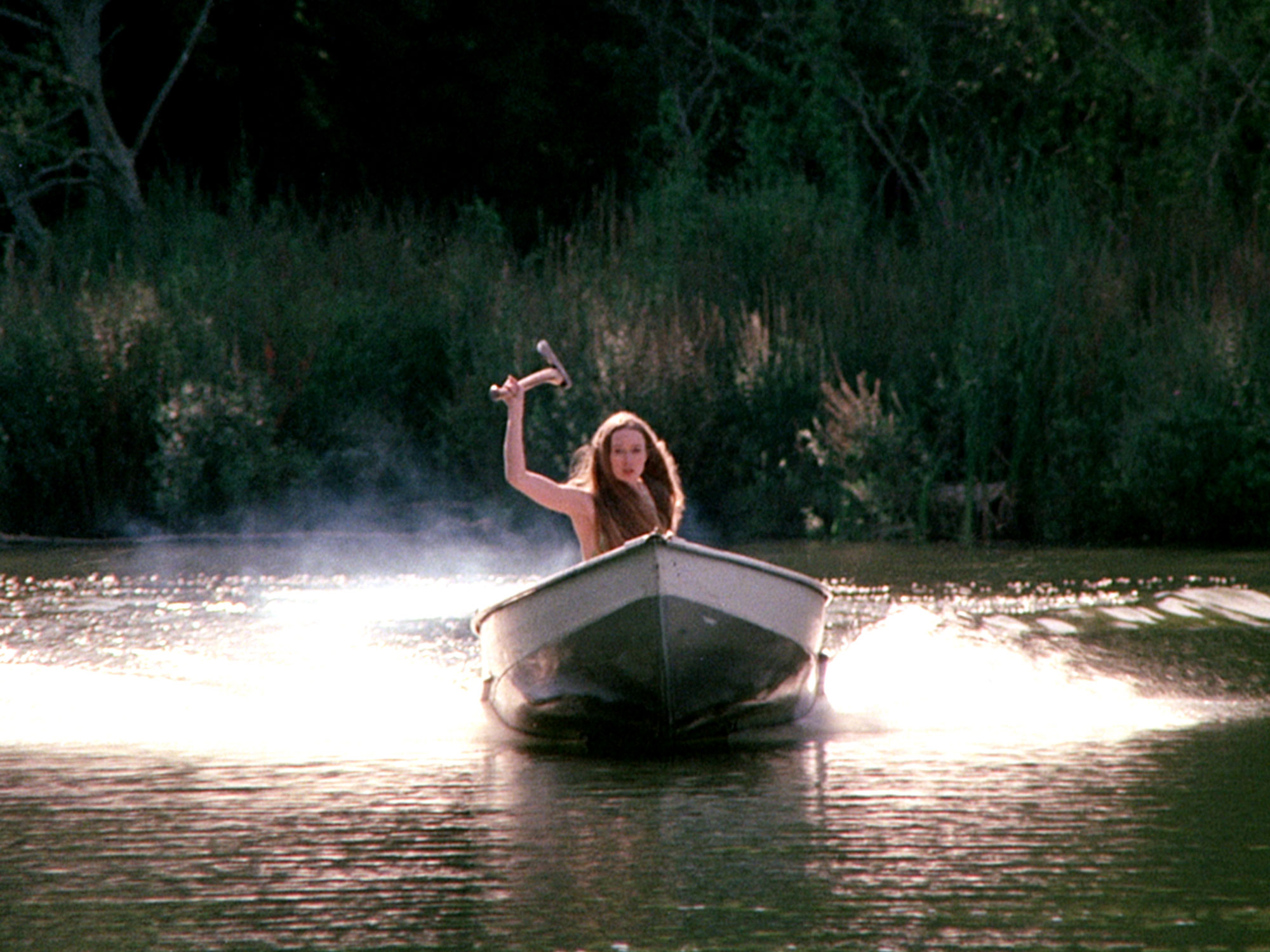 Indeed, I Spit on Your Grave is just as well-known for the scene of the attack on Hills as it is for the retributory violence then inflicted by the young heroine on her assaillants. Luring them one by one, she proceeds to murder them in increasingly specific and imaginative ways. “I especially enjoyed doing the motorboat scene,” Keaton reflects, referring to the moment when her character chases down one of her attackers in a speedboat, steering the engine with one hand and holding a small axe in the other. “We did those in the last couple of days of filming. I’d never operated a motorboat before!”
